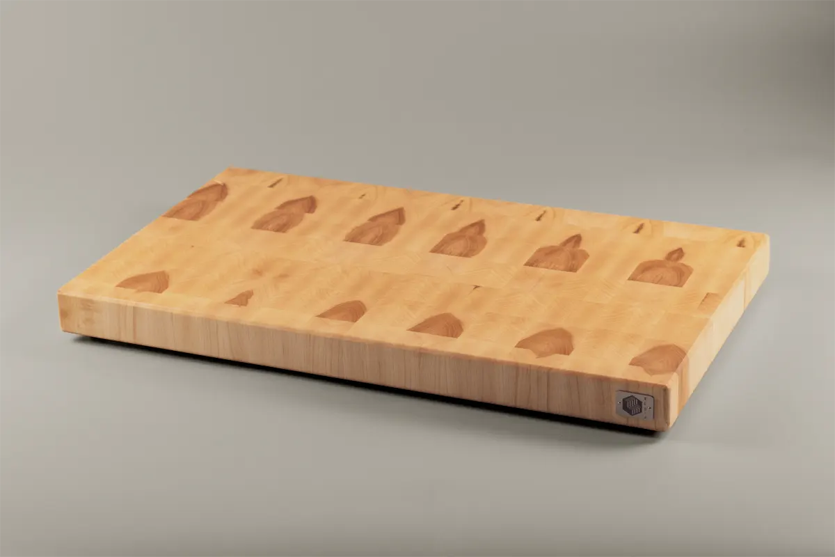 Gracias a su construcción en end grain o testa, la superficie de la tabla es más suave con sus cuchillos y, a la vez, increíblemente resistente al uso diario.